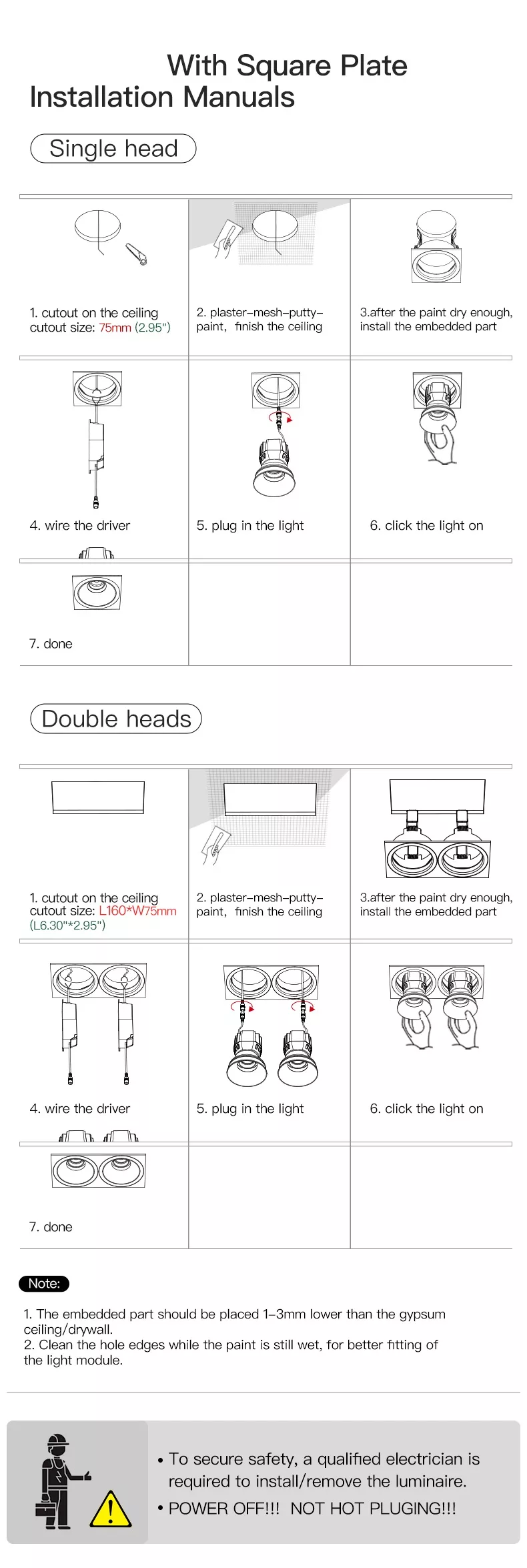 Constructed from high-quality aluminum, the fixture is built for long-term durability and efficient heat dissipation. With a total power consumption of 2 × 12W, it delivers strong illumination while remaining energy efficient. The no-plaster installation design simplifies fitting, making it suitable for both new builds and renovation projects.