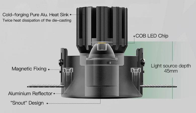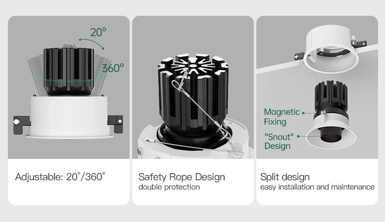 Elevate your interior lighting with the Flush Spotlight, a premium LED round downlight perfect for recessed ceiling installations. With its slim 82mm height and 75mm cutout size, this light integrates seamlessly into your ceiling, providing a clean and minimalist aesthetic. Supporting up to 15W, it delivers powerful illumination while maintaining energy efficiency. The Flush Spotlights offer freely adjustable angles, allowing you to direct light precisely where it’s needed—ideal for accentuating architectural features or creating ambient moods. Its advanced cold-forged aluminum heat sink ensures optimal heat dissipation, enhancing the LED’s performance and longevity. The magnetic fixing system combined with a safety rope design simplifies installation and maintenance without compromising safety. Featuring a high Color Rendering Index (CRI) of ≥Ra97, this downlight renders colors vividly and accurately, enhancing the visual appeal of your space. The metal reflector cup paired with a “snout” design optimizes light distribution and incorporates multiple anti-glare features, providing soft, comfortable illumination that reduces eye strain.