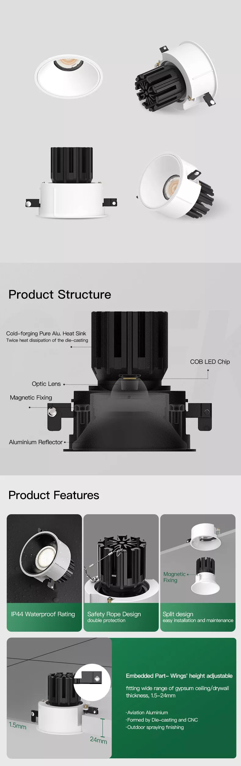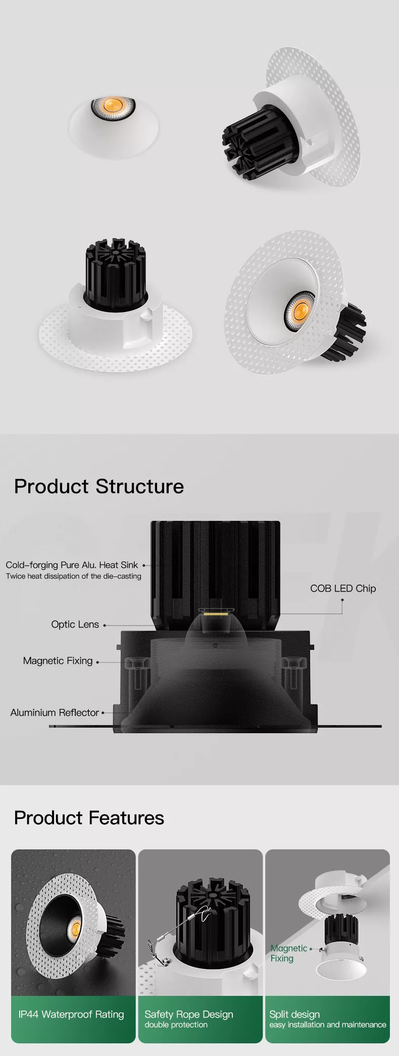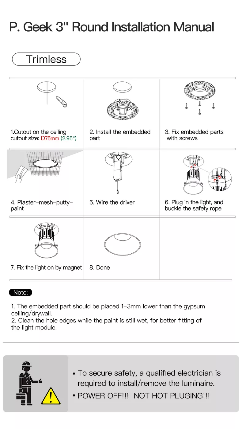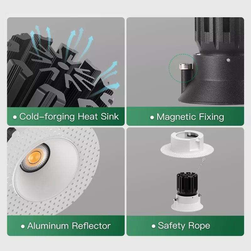 Installation is straightforward thanks to a split-body approach that allows rough-in first and final trim later. Servicing is clean because the light module can be accessed without destroying the ceiling finish.