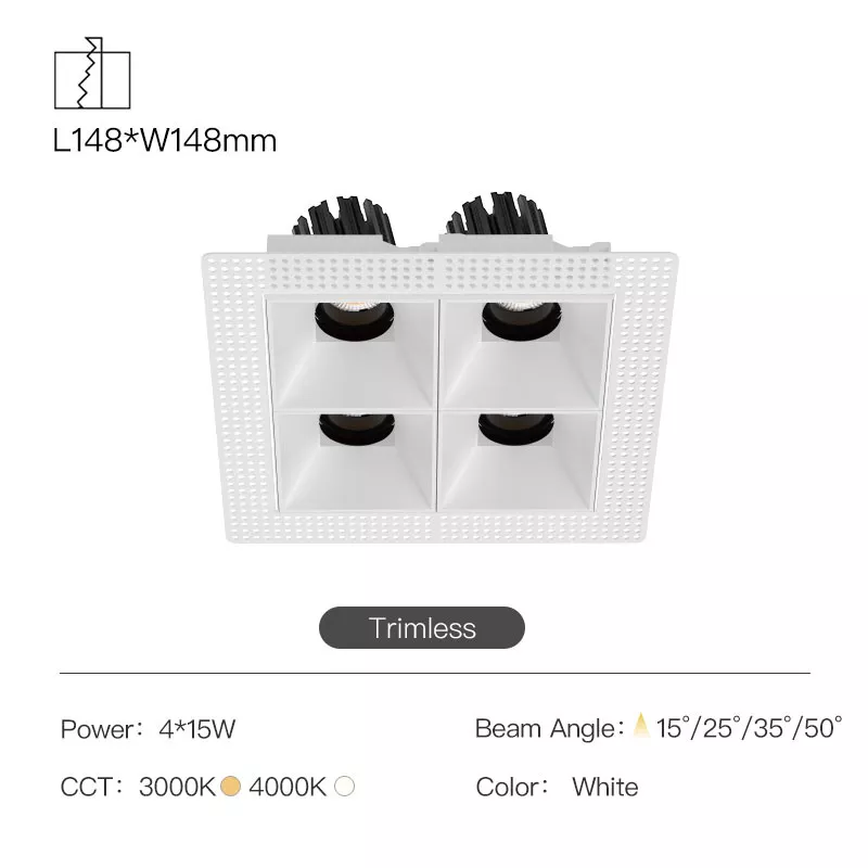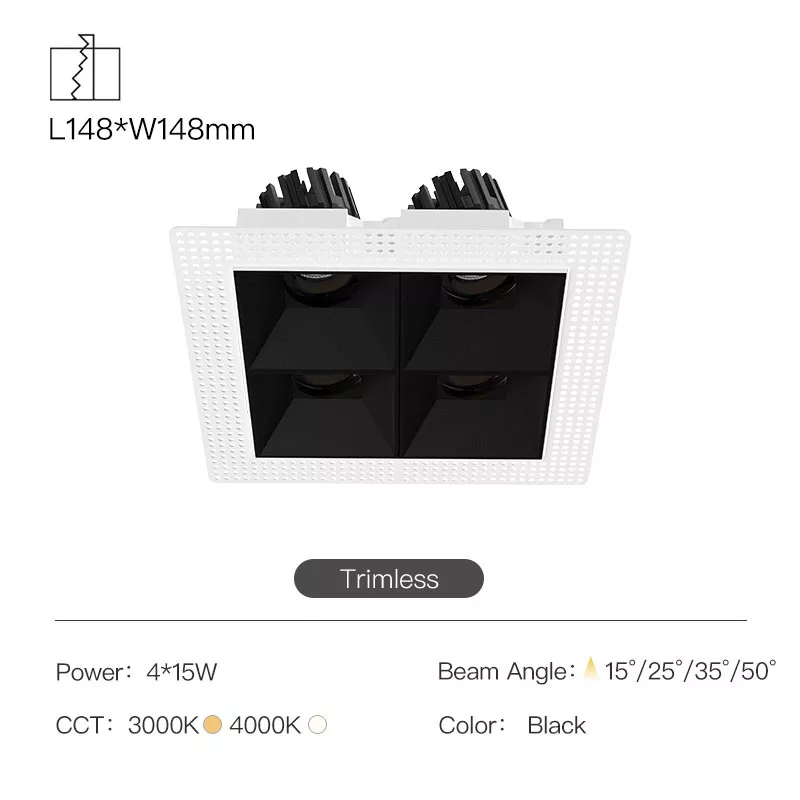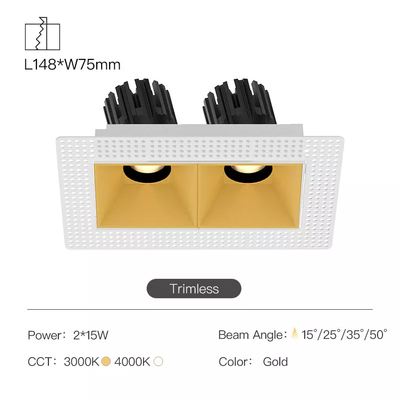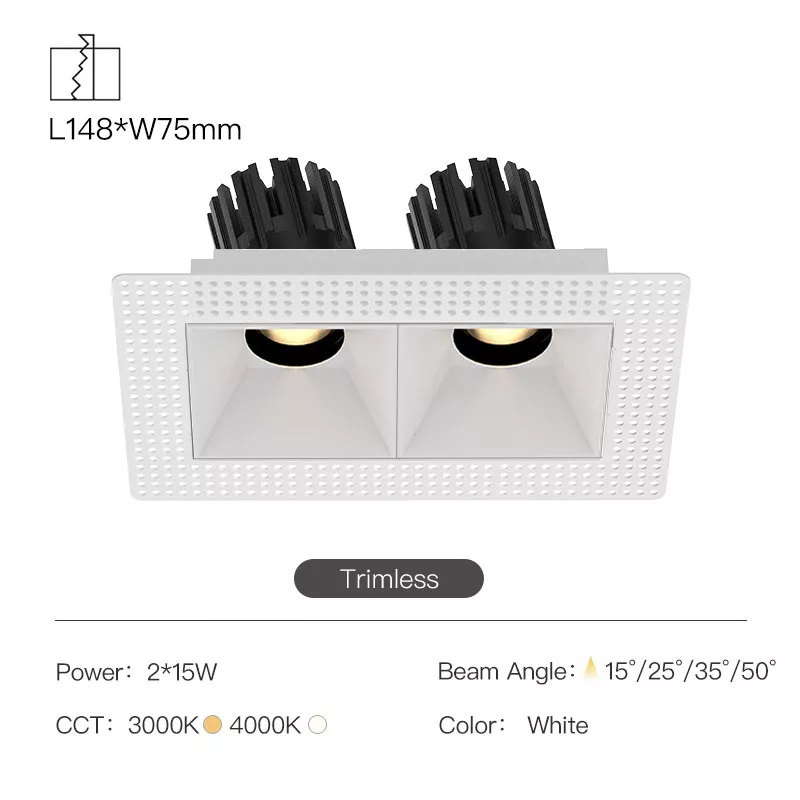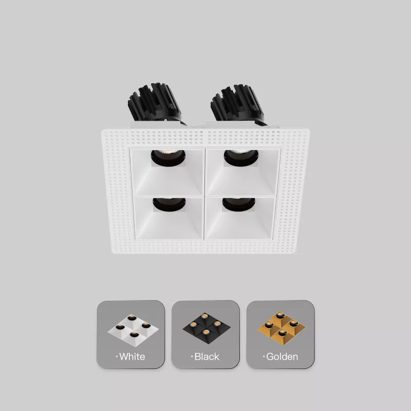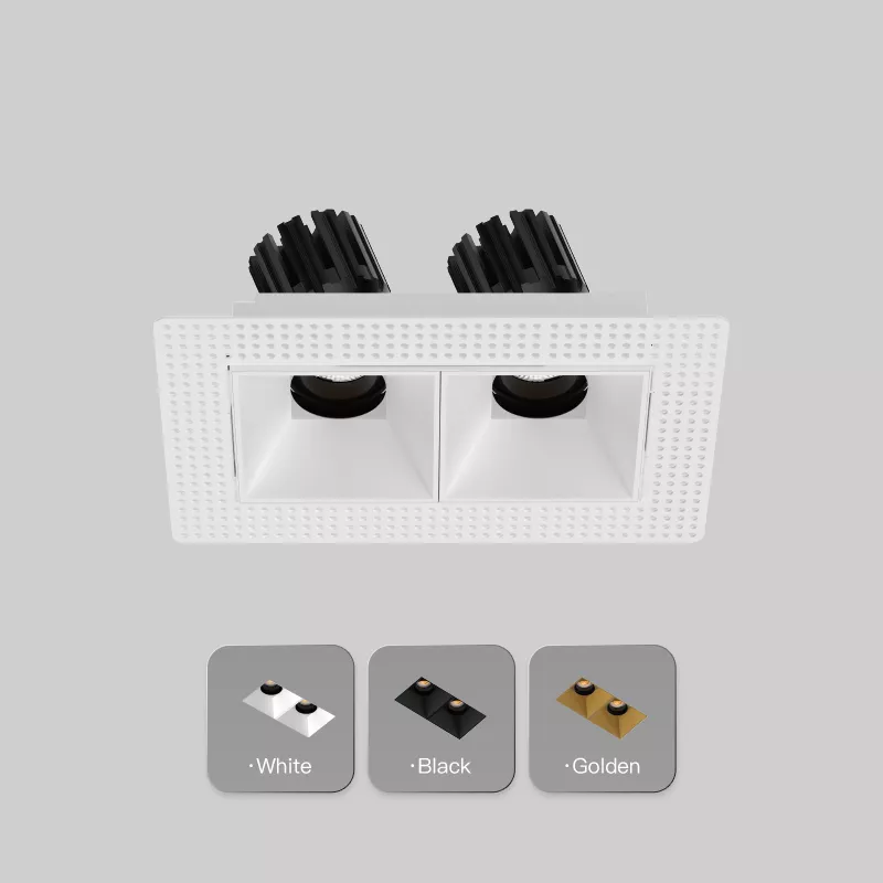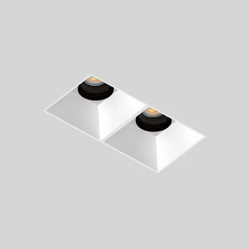The 3 Inch Recessed Square Adjustable Double Downlight is designed for spaces that need more than one accent point without cluttering the ceiling. It comes in two trim styles so it fits different architectural finishes: a micro flange version with a clean, minimal border for a crisp detail, and a trimless version for a seamless plaster-in look. Same light engine and performance either way, just a different ceiling expression.