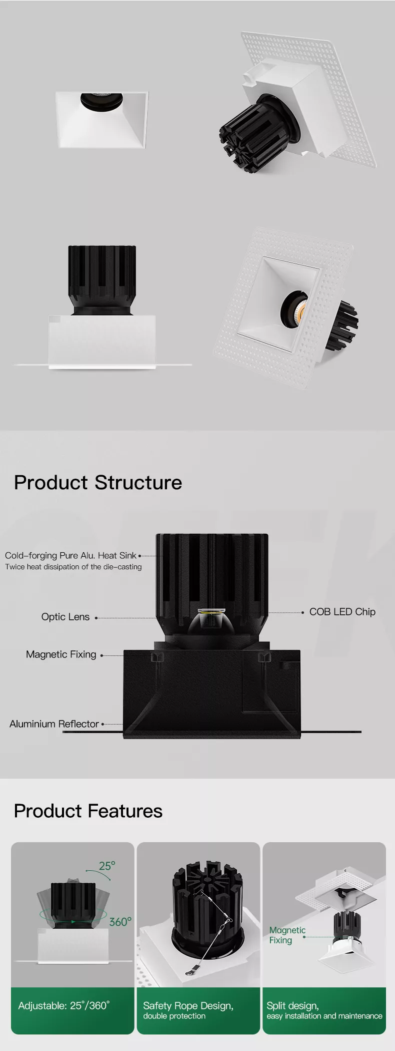 This model is intended for dry interior applications and fits naturally into living spaces, kitchens outside wet zones, boutique retail, hotel rooms, galleries, and design-driven commercial interiors. Whether you go micro flange or trimless, you get the same aiming flexibility and light performance, just matched to your ceiling finish.