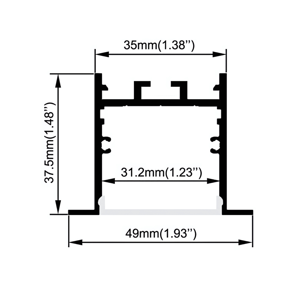 The LED Aluminum Channel for Strip Lights – RC3535 delivers sophisticated recessed lighting solutions for discerning lighting professionals and design enthusiasts. This premium channel features generous dimensions of 35mm width by 37.5mm height, with an impressive 31.4mm internal mounting area that accommodates the FL2835-120-8mm LED strips (12V/24V, 13W/m, 1350LM/m) with ample space for optimal heat dissipation. Crafted from high-quality AL6063-T5 aluminum, the RC3535 provides superior thermal management to maximize LED performance and extend operational lifespan. What distinguishes this channel is its elegant recessed design, creating a clean, architectural appearance with the light source integrated seamlessly into ceilings, walls, or cabinetry for a sophisticated, built-in aesthetic. The overall mounting width of 49mm ensures secure installation in various surfaces, while the included spring clips provide straightforward and reliable fixture placement. The professional-grade PMMA opal diffuser transforms concentrated LED points into a smooth, uniform glow that enhances visual comfort without sacrificing brightness. Available in three premium finishes—silver, black, or white—to complement any interior design scheme, each 2-meter length comes complete with matching endcaps for a polished, finished appearance. The RC3535 recessed aluminum channel is ideal for creating discreet ambient lighting in luxury residential environments, elegant hospitality spaces, upscale retail displays, and contemporary office interiors where sophisticated, integrated illumination is desired. This premium housing solution elevates standard LED strip lights into professional architectural lighting features that blend seamlessly with surrounding surfaces while delivering exceptional illumination quality.